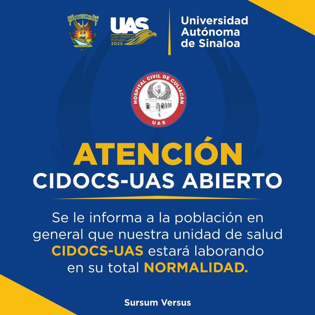 El director del CIDOCS de la UAS manifestó que esta decisión “muy sensata” que se tomó de seguir con la práctica diaria es porque son conscientes también de que mucha población que se atienden en las diferentes especialidades médicas viene de fuera y requieren la atención, por lo que no se les puede reprogramar o demorar la atención médica, por lo que hizo especial énfasis en que seguirán trabajando en horarios y días acostumbrados.